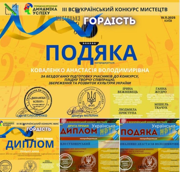 Керівницю гуртка – Коваленко Анастасію Володимирівну – було відзначено подякою за професійну підготовку учасників до конкурсів, плідну творчу співпрацю, збереження та розвиток культури України.