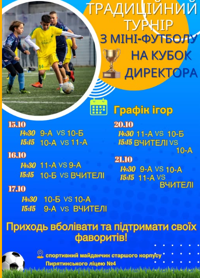 Передостанній тиждень перед осінніми канікулами обіцяє бути енергійним та насиченим Розпочинаємо тиждень Традиційного турніру з міні-футболу на Кубок директора Ознайомтесь…