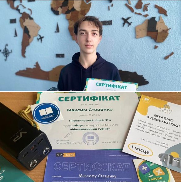 А ось і наші подарунки, такі довгоочікувані і бажані, за перше місце у конкурсі «Математичний турнір» —Максим Стеценко, Пирятинський ліцей…
